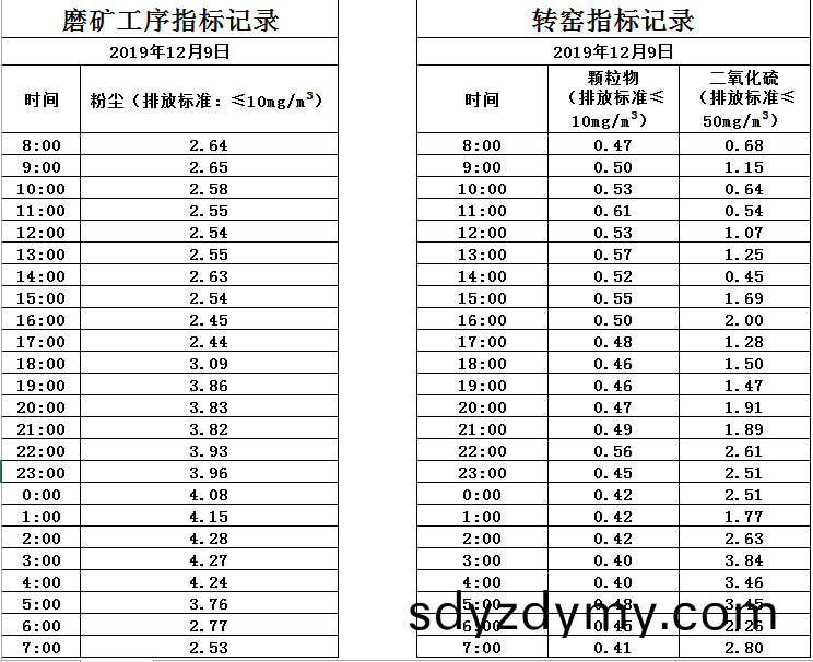 山東道(dao)恩鈦(tai)業(ye)股(gu)份(fen)有限(xian)公(gong)司2019年(nian)12月9日(ri)磨鑛(kuang)工序煙氣(qi)及轉(zhuan)窰(yao)煙氣(qi)指標數據:山東道(dao)恩(en)鈦(tai)業(ye)股份(fen)有限公司2019年(nian)12月(yue)9日(ri)煙(yan)氣(qi)數據