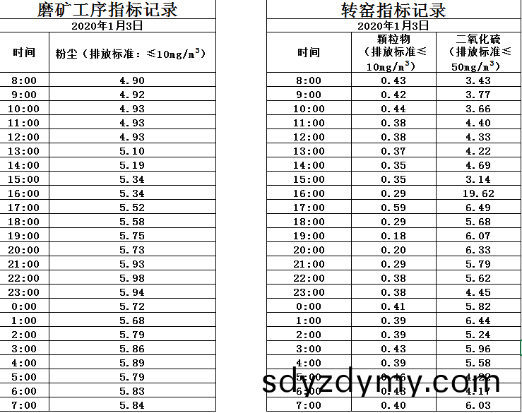 山(shan)東道恩鈦(tai)業(ye)股份有限公(gong)司(si)2020年(nian)1月3日磨(mo)鑛(kuang)工序(xu)煙(yan)氣(qi)及轉窰(yao)煙氣指標(biao)數(shu)據(ju):山東道恩鈦(tai)業(ye)股份有(you)限(xian)公司(si)2020年1月3日煙(yan)氣數(shu)據