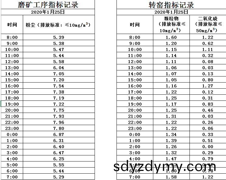 山東(dong)道恩鈦業(ye)股(gu)份(fen)有(you)限(xian)公司2020年(nian)1月25日(ri)磨(mo)鑛工序煙(yan)氣及(ji)轉窰(yao)煙氣指(zhi)標(biao)數(shu)據: