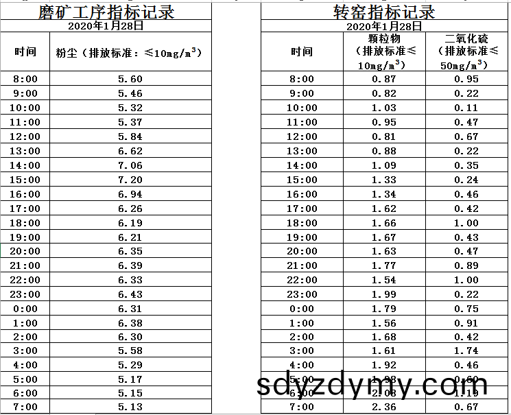 山東道恩鈦業股份(fen)有(you)限公(gong)司2020年1月(yue)28磨(mo)鑛工序煙(yan)氣及(ji)轉(zhuan)窰煙氣指(zhi)標(biao)數據: