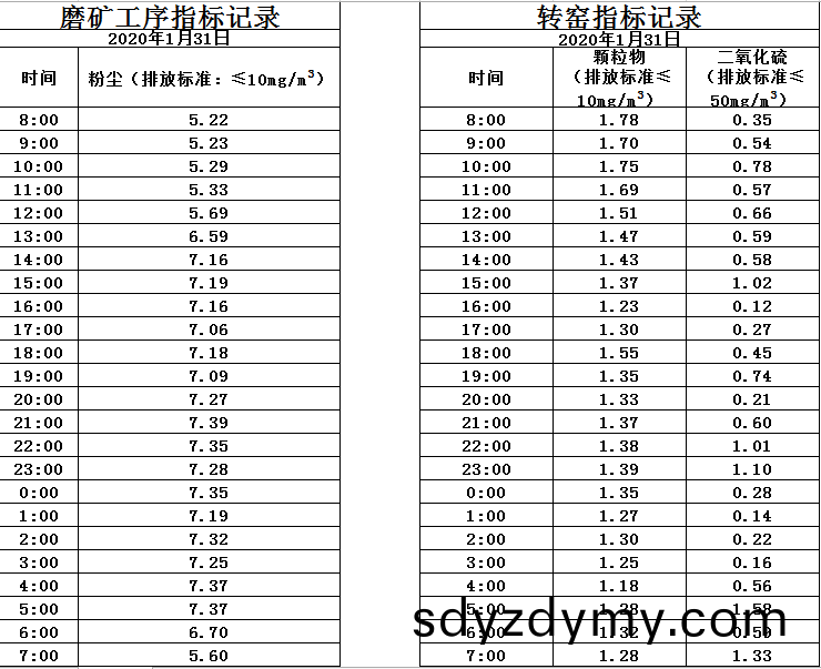 山東(dong)道恩(en)鈦(tai)業股(gu)份(fen)有(you)限(xian)公司(si)2020年1月(yue)31磨鑛工序(xu)煙(yan)氣(qi)及轉窰(yao)煙(yan)氣(qi)指(zhi)標數(shu)據: