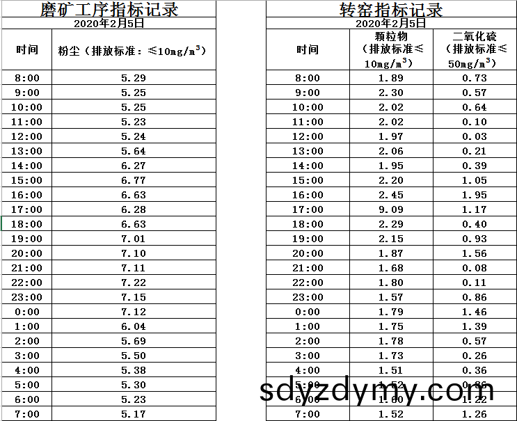 山(shan)東(dong)道恩(en)鈦業(ye)股(gu)份(fen)有限(xian)公司(si)2020年(nian)2月(yue)5磨(mo)鑛(kuang)工序煙氣(qi)及轉(zhuan)窰煙氣(qi)指標(biao)數(shu)據(ju):