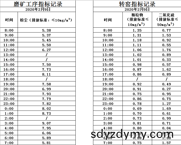 山(shan)東(dong)道(dao)恩鈦(tai)業(ye)股份(fen)有限(xian)公司(si)2020年2月(yue)9磨鑛(kuang)工(gong)序(xu)煙(yan)氣(qi)及轉窰(yao)煙(yan)氣指(zhi)標(biao)數(shu)據:
