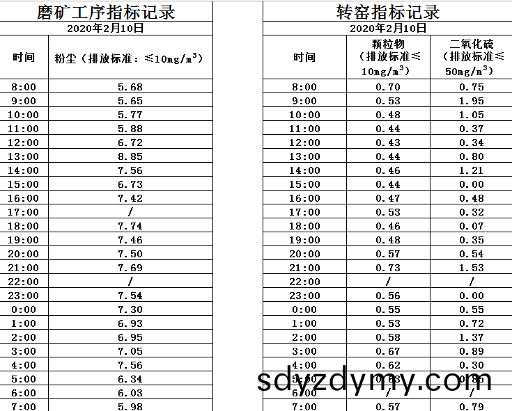 山(shan)東(dong)道(dao)恩(en)鈦(tai)業股份(fen)有(you)限(xian)公(gong)司(si)2020年(nian)2月(yue)10磨(mo)鑛工(gong)序(xu)煙(yan)氣(qi)及(ji)轉窰(yao)煙(yan)氣指(zhi)標數(shu)據: