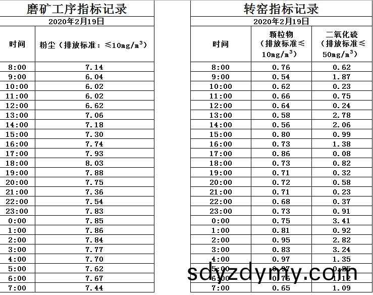 山(shan)東道恩鈦(tai)業股(gu)份有限公(gong)司(si)2020年(nian)2月19磨(mo)鑛工序煙氣及轉(zhuan)窰煙(yan)氣指標(biao)數(shu)據: