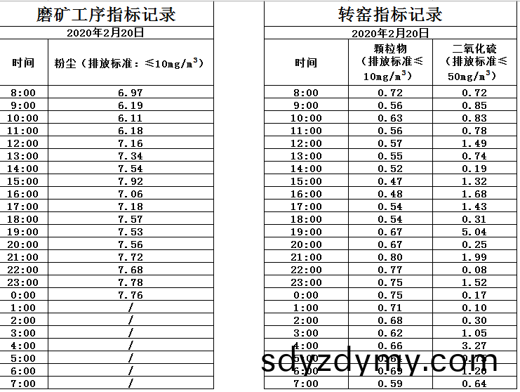 山東道(dao)恩(en)鈦業股(gu)份(fen)有限公(gong)司(si)2020年(nian)2月(yue)20磨(mo)鑛(kuang)工(gong)序(xu)煙(yan)氣(qi)及(ji)轉窰煙(yan)氣指標數據(ju):