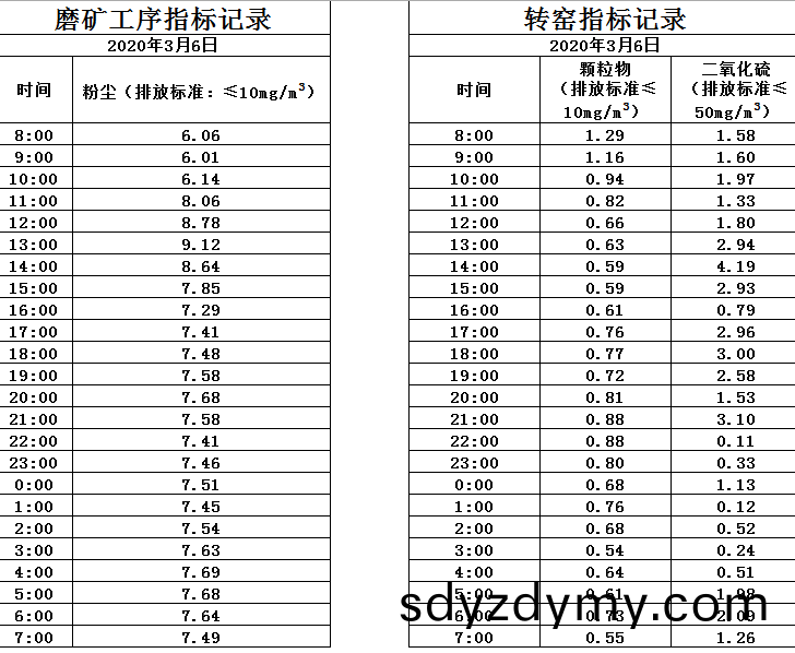 山東(dong)道恩(en)鈦業(ye)股(gu)份有限公司(si)2020年(nian)3月6磨鑛工序煙氣及(ji)轉窰(yao)煙(yan)氣指(zhi)標(biao)數(shu)據(ju):