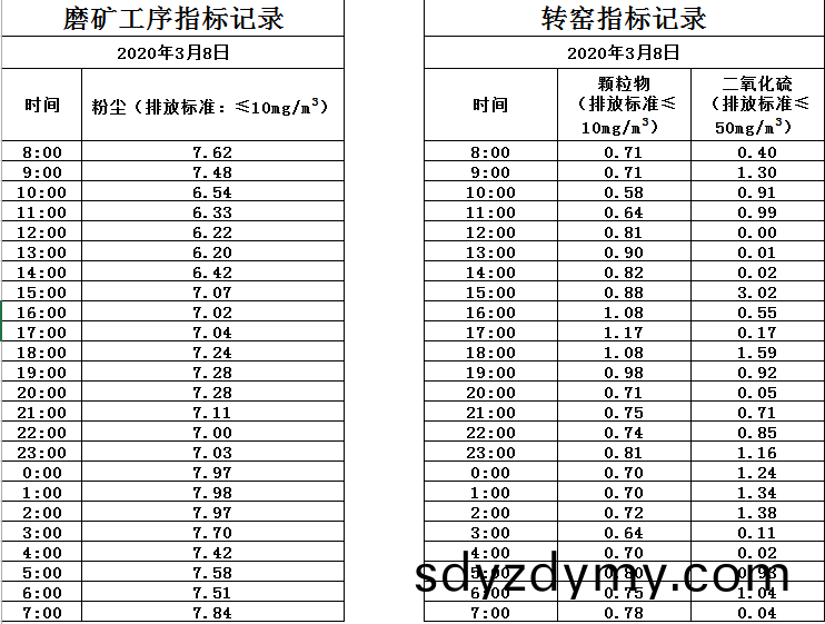 山(shan)東(dong)道恩鈦業股(gu)份有限(xian)公(gong)司(si)2020年(nian)3月8磨鑛工(gong)序(xu)煙(yan)氣(qi)及(ji)轉(zhuan)窰煙氣(qi)指(zhi)標數(shu)據: