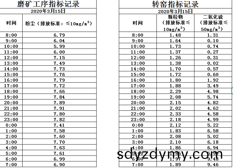 山東道(dao)恩(en)鈦(tai)業(ye)股份有(you)限公司2020年(nian)3月(yue)15磨(mo)鑛(kuang)工(gong)序煙氣及(ji)轉(zhuan)窰(yao)煙氣指標(biao)數(shu)據(ju):