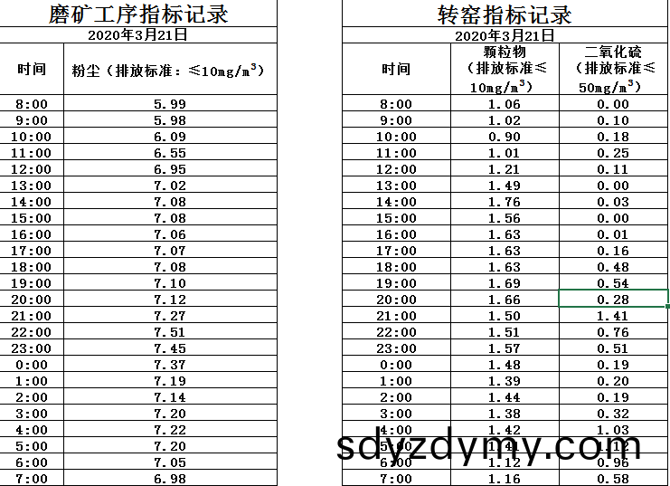 山(shan)東道恩鈦(tai)業(ye)股(gu)份(fen)有限(xian)公司(si)2020年(nian)3月21磨鑛(kuang)工序(xu)煙氣(qi)及轉(zhuan)窰(yao)煙(yan)氣指標數(shu)據(ju):