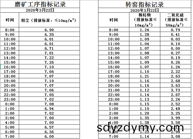 山(shan)東道恩鈦(tai)業(ye)股份(fen)有限(xian)公(gong)司2020年3月22磨(mo)鑛(kuang)工(gong)序(xu)煙氣及轉窰煙氣(qi)指標數據(ju):