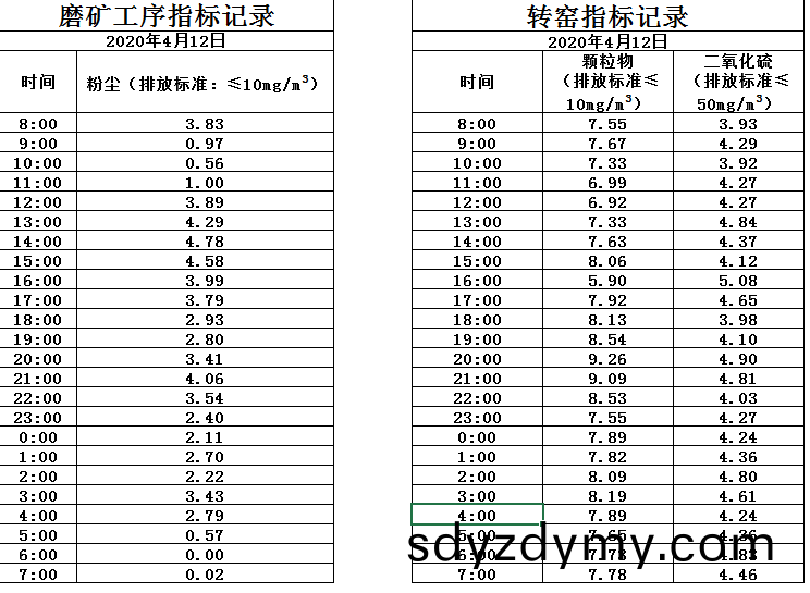 山(shan)東(dong)道恩鈦業股份(fen)有(you)限(xian)公(gong)司(si)2020年(nian)4月(yue)12磨(mo)鑛工(gong)序煙(yan)氣(qi)及轉(zhuan)窰(yao)煙氣(qi)指標(biao)數據(ju):