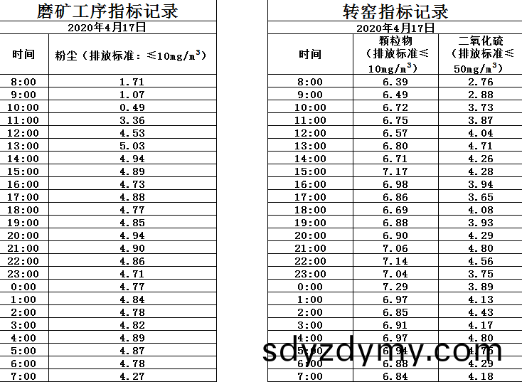 山東道(dao)恩(en)鈦(tai)業股(gu)份(fen)有(you)限公司2020年4月17磨鑛(kuang)工序(xu)煙氣及轉(zhuan)窰(yao)煙(yan)氣指(zhi)標數據(ju):