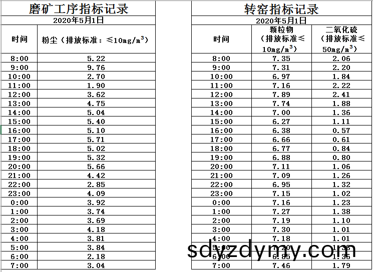 山東道(dao)恩鈦業(ye)股(gu)份有限(xian)公司2020年(nian)5月(yue)1磨鑛工序(xu)煙氣(qi)及(ji)轉(zhuan)窰煙氣指標數據: