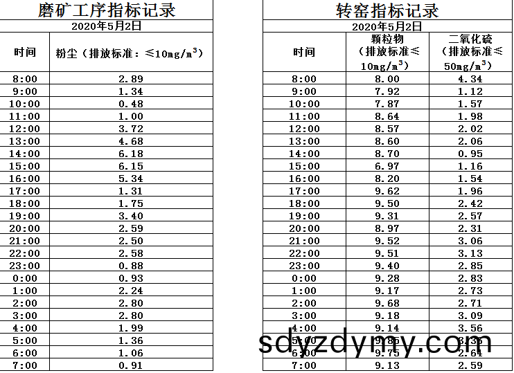 山(shan)東道(dao)恩(en)鈦(tai)業(ye)股(gu)份(fen)有限公(gong)司(si)2020年(nian)5月2磨(mo)鑛(kuang)工(gong)序(xu)煙(yan)氣及轉(zhuan)窰煙氣(qi)指(zhi)標(biao)數(shu)據: