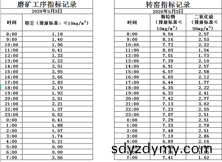 山(shan)東(dong)道(dao)恩鈦業股份(fen)有限公司(si)2020年5月(yue)3磨鑛工(gong)序煙(yan)氣及(ji)轉窰煙氣指(zhi)標(biao)數(shu)據(ju):