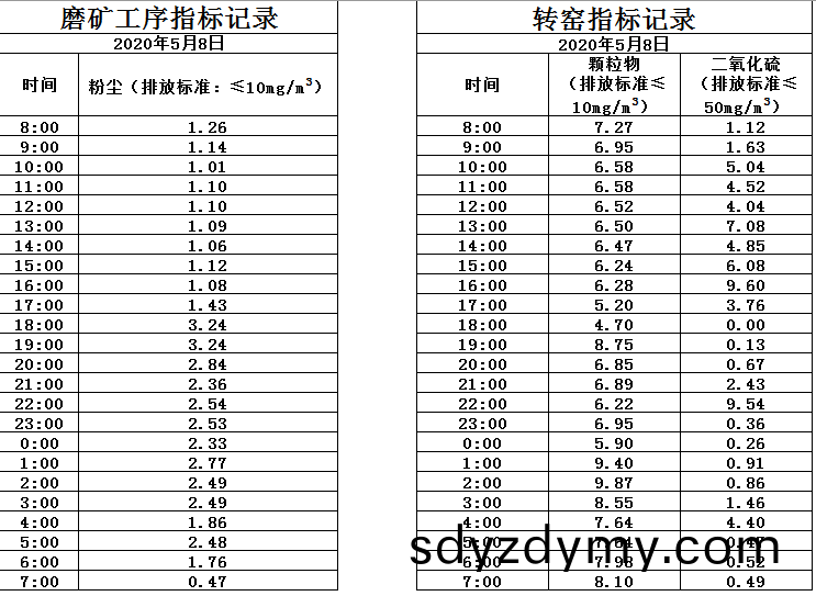 山(shan)東(dong)道恩鈦業股(gu)份有(you)限公司2020年5月8磨鑛(kuang)工序煙氣及轉(zhuan)窰(yao)煙氣指標數據(ju):