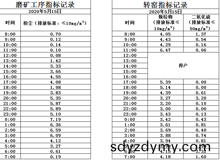 山東道恩(en)鈦業股份(fen)有(you)限公(gong)司2020年5月(yue)15磨(mo)鑛(kuang)工序煙氣(qi)及(ji)轉窰(yao)煙(yan)氣(qi)指(zhi)標數據(ju):