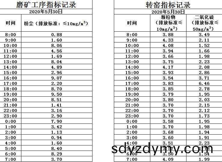 山東道恩鈦(tai)業股(gu)份(fen)有限公(gong)司(si)2020年(nian)5月(yue)30磨鑛(kuang)工序(xu)煙(yan)氣及(ji)轉窰煙(yan)氣指(zhi)標數(shu)據(ju):