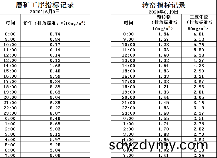 山東(dong)道恩(en)鈦業股(gu)份(fen)有(you)限(xian)公(gong)司(si)2020年6月9磨鑛工序(xu)煙氣(qi)及轉(zhuan)窰(yao)煙氣(qi)指標數據: