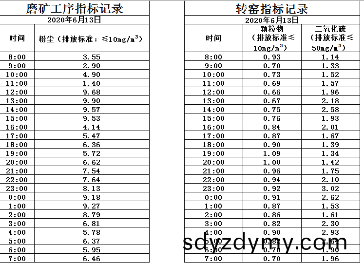 山東道(dao)恩(en)鈦業股(gu)份有(you)限(xian)公(gong)司2020年6月(yue)13磨(mo)鑛(kuang)工序(xu)煙氣及轉窰煙(yan)氣(qi)指標(biao)數(shu)據(ju):
