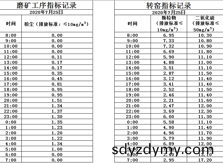 山東道(dao)恩鈦(tai)業(ye)股份有(you)限公司2020年7月25磨鑛(kuang)工序煙(yan)氣及轉(zhuan)窰煙氣(qi)指標(biao)數(shu)據: