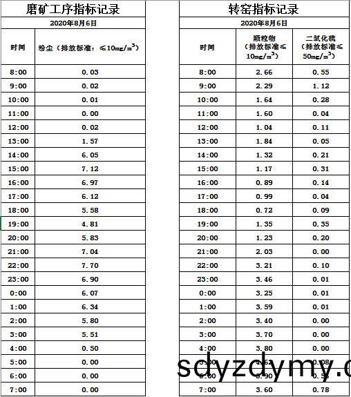 山(shan)東道(dao)恩(en)鈦(tai)業(ye)股份有(you)限公(gong)司2020年8月6磨(mo)鑛(kuang)工序(xu)煙(yan)氣及轉窰煙氣指(zhi)標(biao)數據: