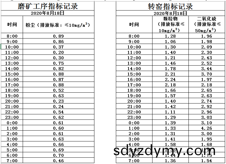 山東道(dao)恩(en)鈦業股份(fen)有限(xian)公司2020年(nian)8月(yue)18磨(mo)鑛(kuang)工序(xu)煙氣及轉窰煙氣(qi)指標(biao)數(shu)據: