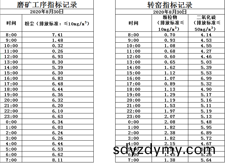 山(shan)東道恩鈦(tai)業股(gu)份有(you)限(xian)公司(si)2020年8月30磨鑛(kuang)工序(xu)煙氣及轉窰(yao)煙氣(qi)指標數據(ju):