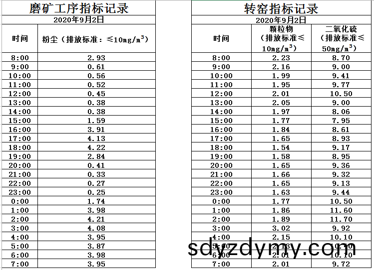 山(shan)東道恩(en)鈦業股份(fen)有(you)限(xian)公(gong)司(si)2020年(nian)9月(yue)2磨(mo)鑛(kuang)工(gong)序(xu)煙(yan)氣(qi)及(ji)轉(zhuan)窰(yao)煙氣指(zhi)標(biao)數據(ju):