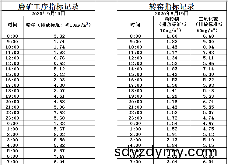山(shan)東道恩鈦(tai)業(ye)股份(fen)有(you)限公司(si)2020年9月19磨鑛(kuang)工序(xu)煙氣(qi)及轉窰煙氣(qi)指(zhi)標數據: