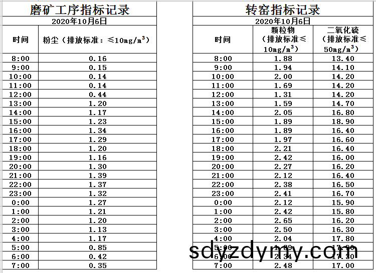 山(shan)東道(dao)恩(en)鈦(tai)業(ye)股份有(you)限公司2020年(nian)10月(yue)6磨(mo)鑛(kuang)工序(xu)煙氣(qi)及轉窰(yao)煙(yan)氣指(zhi)標(biao)數據:
