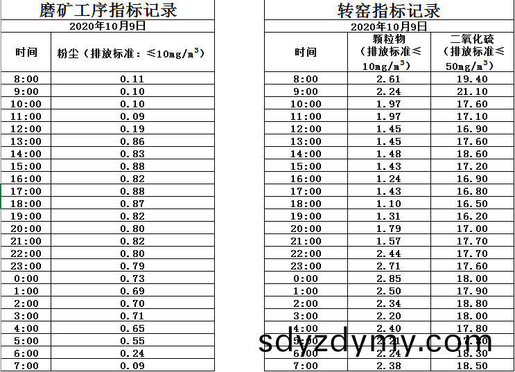 山(shan)東(dong)道恩(en)鈦(tai)業(ye)股份(fen)有限公司(si)2020年(nian)10月(yue)9磨(mo)鑛(kuang)工序(xu)煙(yan)氣及轉窰(yao)煙(yan)氣(qi)指(zhi)標(biao)數據(ju):