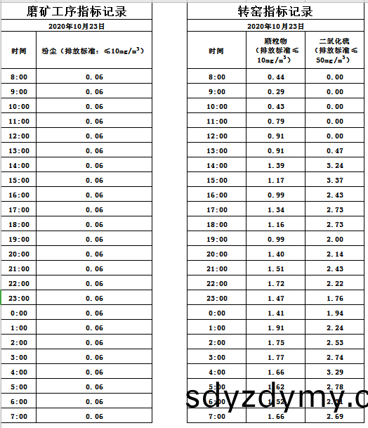 山(shan)東(dong)道恩鈦(tai)業股份(fen)有限公司2020年10月23磨(mo)鑛(kuang)工(gong)序(xu)煙(yan)氣(qi)及轉窰(yao)煙氣(qi)指(zhi)標數據: