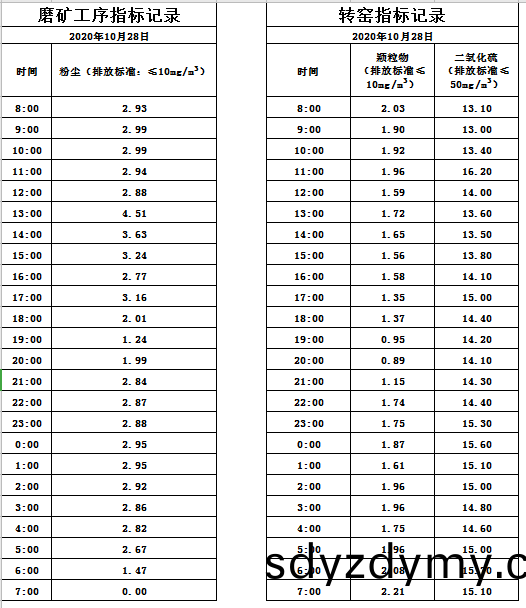 山東(dong)道(dao)恩(en)鈦業(ye)股(gu)份(fen)有限公司(si)2020年10月(yue)28磨鑛(kuang)工序(xu)煙氣及轉窰(yao)煙氣(qi)指標數據(ju):