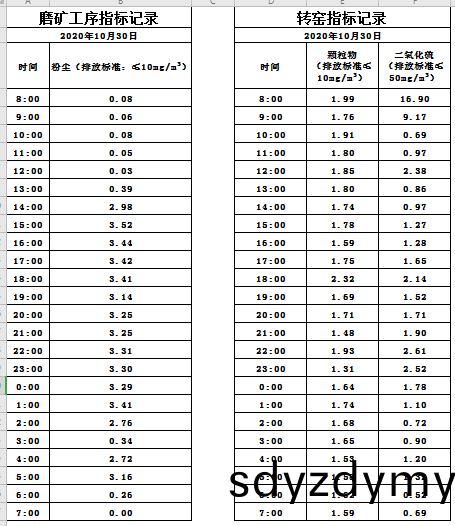 山東道(dao)恩(en)鈦(tai)業股(gu)份有(you)限(xian)公(gong)司2020年10月(yue)30磨鑛(kuang)工(gong)序煙氣(qi)及轉(zhuan)窰(yao)煙氣指標數據: