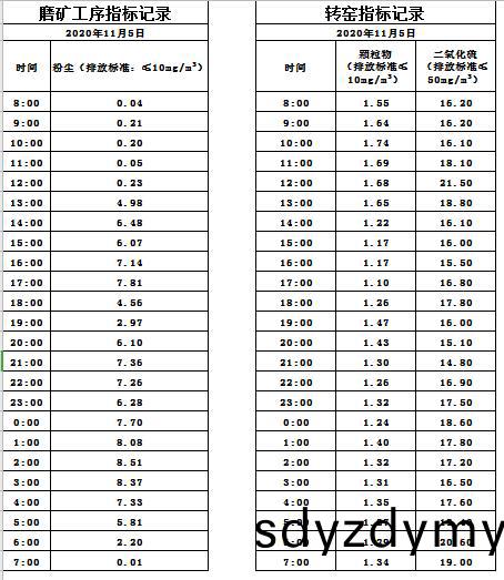 山(shan)東(dong)道(dao)恩鈦業(ye)股(gu)份(fen)有限(xian)公司(si)2020年11月(yue)5磨(mo)鑛(kuang)工序煙(yan)氣(qi)及轉(zhuan)窰(yao)煙(yan)氣指標(biao)數據: