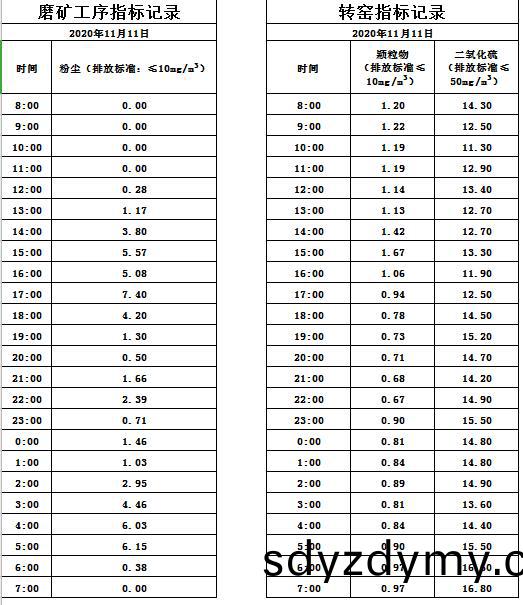 山(shan)東道恩(en)鈦(tai)業股(gu)份有限公司(si)2020年11月11磨(mo)鑛工序煙(yan)氣(qi)及轉窰(yao)煙(yan)氣(qi)指(zhi)標(biao)數(shu)據: