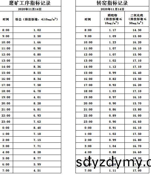 山東道(dao)恩鈦業股份有(you)限(xian)公(gong)司2020年11月(yue)14磨(mo)鑛工(gong)序煙氣及(ji)轉窰煙(yan)氣指(zhi)標數據(ju):