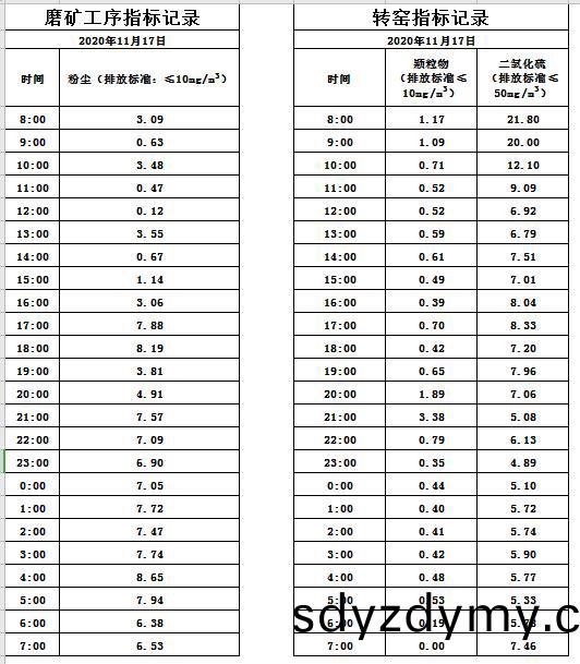 山東道恩鈦(tai)業(ye)股份(fen)有(you)限公(gong)司(si)2020年11月(yue)17磨鑛(kuang)工序煙氣(qi)及(ji)轉窰煙氣指標(biao)數(shu)據: