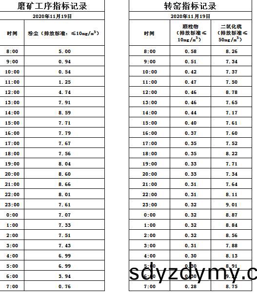 山(shan)東道恩鈦(tai)業股(gu)份(fen)有限(xian)公司(si)2020年11月(yue)19磨鑛工(gong)序(xu)煙(yan)氣(qi)及轉窰(yao)煙(yan)氣(qi)指標(biao)數據(ju):