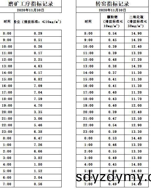 山東(dong)道恩鈦(tai)業(ye)股份有(you)限公司2020年(nian)11月(yue)30磨鑛工序(xu)煙(yan)氣(qi)及(ji)轉窰(yao)煙(yan)氣(qi)指(zhi)標(biao)數(shu)據: