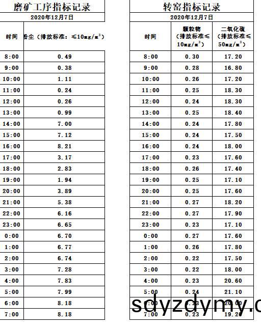 山東道(dao)恩(en)鈦(tai)業(ye)股份(fen)有(you)限(xian)公司(si)2020年(nian)12月7磨(mo)鑛(kuang)工(gong)序(xu)煙(yan)氣及(ji)轉窰(yao)煙氣指標數(shu)據:
