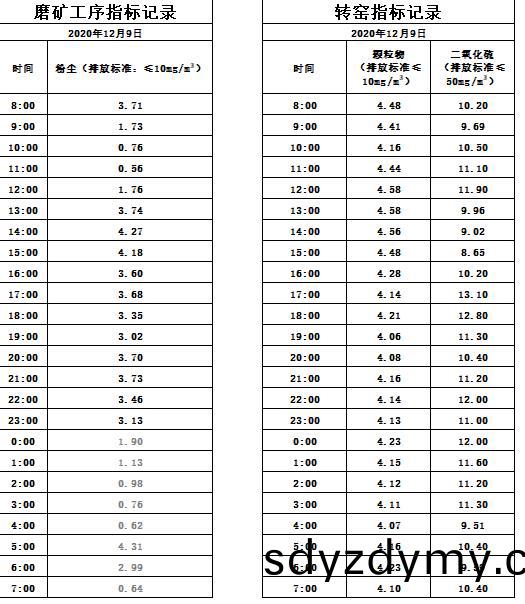 山(shan)東道恩鈦(tai)業(ye)股(gu)份有限(xian)公司2020年12月9磨鑛(kuang)工(gong)序煙氣(qi)及(ji)轉窰煙氣指標(biao)數據(ju):