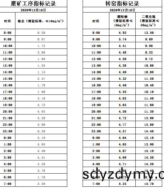 山東(dong)道恩(en)鈦業(ye)股(gu)份(fen)有(you)限公(gong)司(si)2020年12月(yue)10磨鑛(kuang)工序煙(yan)氣及轉窰煙氣(qi)指標(biao)數據:
