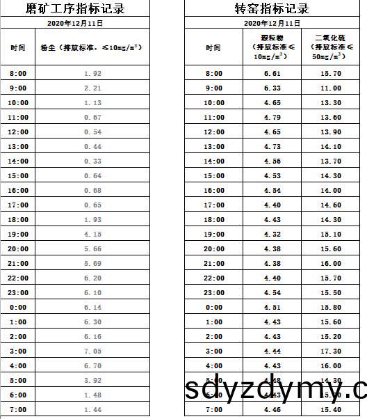 山(shan)東(dong)道恩(en)鈦業(ye)股份有限(xian)公司2020年(nian)12月(yue)11磨(mo)鑛(kuang)工序(xu)煙氣及(ji)轉(zhuan)窰(yao)煙(yan)氣指標(biao)數據: