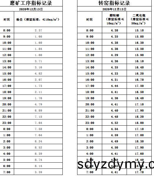 山(shan)東道(dao)恩鈦業(ye)股份有(you)限公(gong)司(si)2020年12月(yue)13磨鑛工序煙氣(qi)及轉窰煙氣指標數(shu)據(ju):