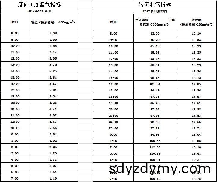 山(shan)東道(dao)恩(en)鈦業(ye)股(gu)份(fen)有(you)限(xian)公司(si)2017年11月29日(ri)磨(mo)鑛工序煙氣及(ji)轉(zhuan)窰煙(yan)氣(qi)指標(biao)數據(ju):山(shan)東道恩鈦(tai)業股(gu)份(fen)有限(xian)公司2017年(nian)11月29日(ri)磨(mo)鑛工(gong)序煙氣(qi)及(ji)轉(zhuan)窰(yao)煙氣指標數(shu)據(ju):