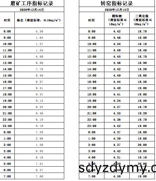 山東(dong)道(dao)恩鈦(tai)業(ye)股(gu)份(fen)有(you)限公司(si)2020年12月(yue)14磨鑛(kuang)工(gong)序煙氣及轉窰煙(yan)氣(qi)指標(biao)數(shu)據:
