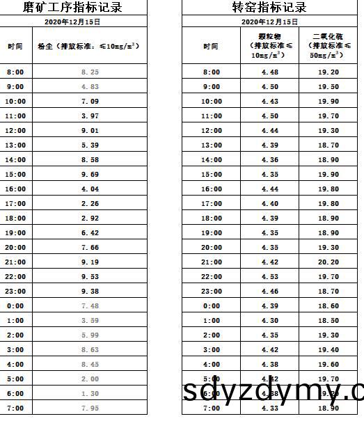 山(shan)東道(dao)恩鈦(tai)業股份(fen)有(you)限公(gong)司2020年(nian)12月15磨鑛(kuang)工序(xu)煙氣及轉(zhuan)窰煙(yan)氣指(zhi)標數據(ju):